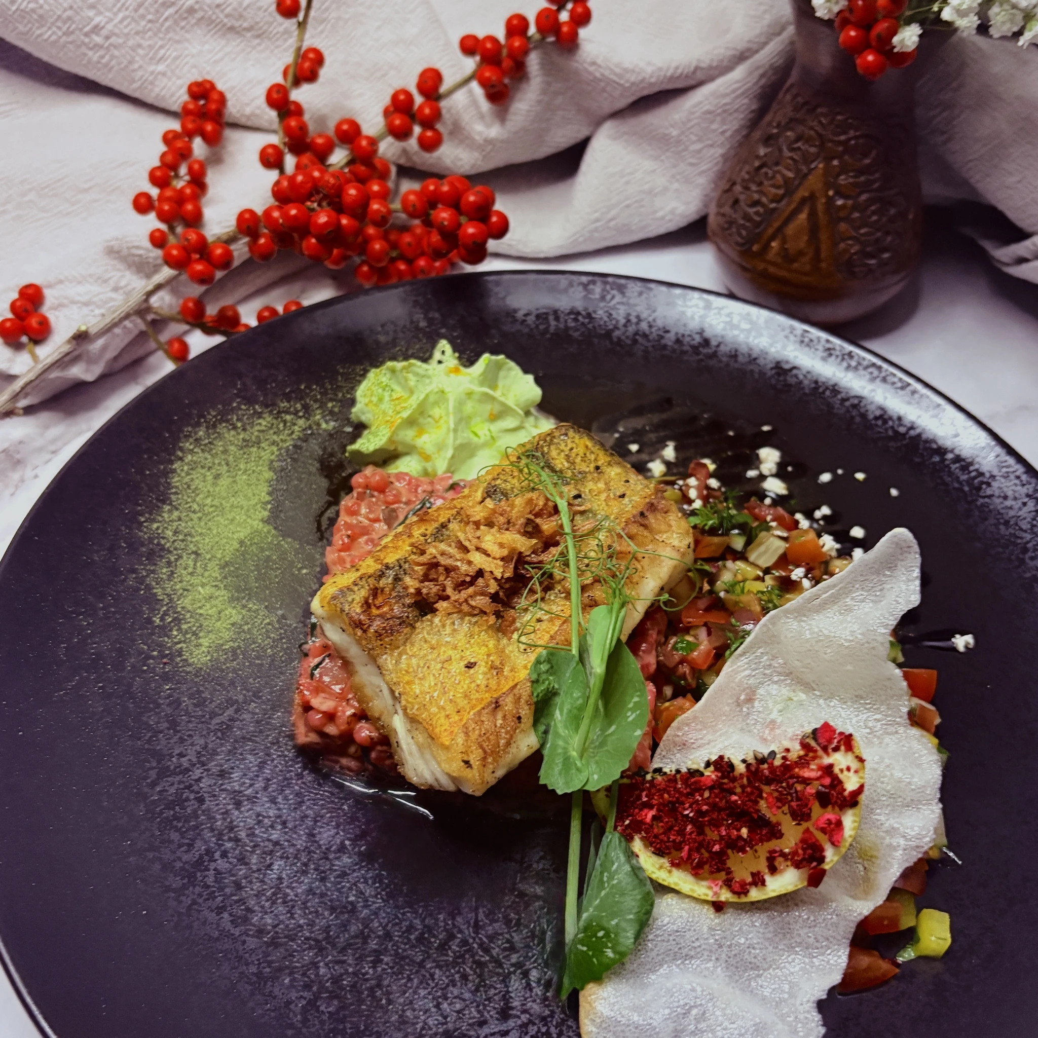 (hautatud kapsas, ahjukartul, marineeritud kõrvits, tkemali kaste)